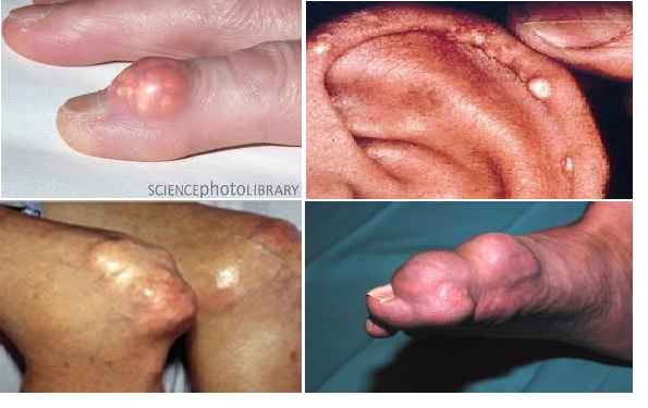 Nếu bệnh nhân gout không điều trị sớm, acid uric lắng đọng tại các khớp dẫn đến hình thành các hạt tophi. Hạt tophi thường xuất hiện ở bàn tay, bàn chân và tai…