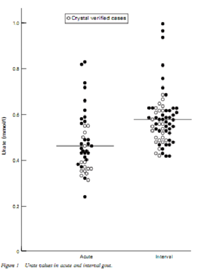 Hầu hết (tất cả các bác sỹ chuyên khoa khớp) đều hiểu vấn đề này mặc dù các tài liệu xuất bản về xương khớp và giáo trình đều nhấn mạnh đây là trường hợp bất thường. Chúng tôi đã tiến hành nghiên cứu để xác định tỷ lệ bệnh nhân có chỉ số SUA bình thường trong cơn gút cấp và cũng so sánh chỉ số SUA trong cơn gút cấp với SUA trong giai đoạn trung gian (khoảng thời gian giữa 2 lần tái phát gút cấp).